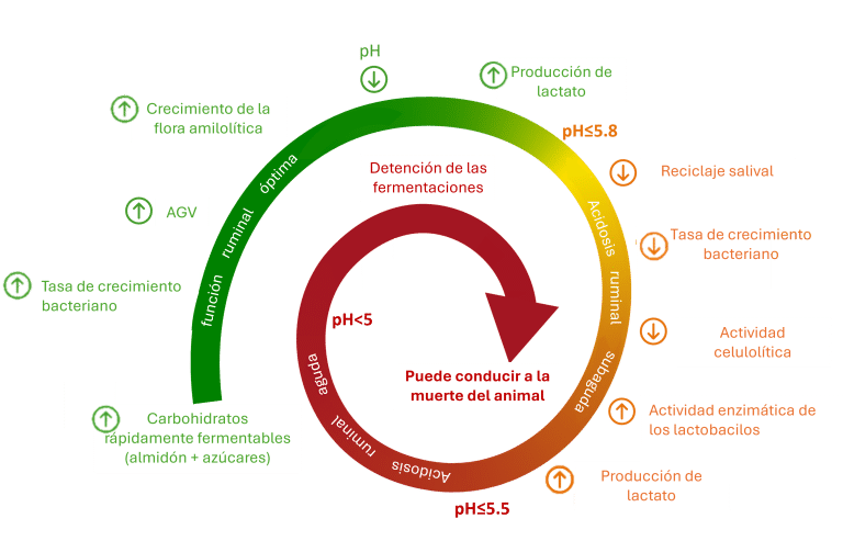 La acidosis ruminal puede definirse como una disminución del pH ruminal cuando la producción de ácidos, en particular ácidos grasos volátiles (AGV), supera su neutralización y absorción. Existen dos formas de acidosis ruminal: la acidosis aguda y la acidosis subclínica o subaguda (Sauvant, Reverdin y Meschy, 2006). Es esta última la que se desarrolla a continuación.