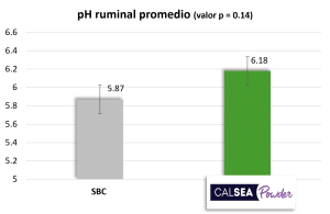 Las vacas que reciben el tratamiento con bicarbonato de sodio (SBC; 200 g/vaca/día) presentan un pH ruminal medio más bajo que aquellas con el tratamiento CALSEA (100 g/vaca/día; Figura 4). El pH ruminal mínimo obtenido con el tratamiento SBC es de 5.45, lo cual es significativamente inferior al pH ruminal mínimo obtenido con CALSEA (Figura 4). Además, con CALSEA, el porcentaje de animales con un pH ruminal < 5.5 es significativamente inferior al del SBC (Figura 4). Un pH < 6 durante al menos 4 horas representa un riesgo de acidosis y, cuando el pH es <5.5, este riesgo es elevado. Según los resultados, la capacidad tampón de CALSEA es superior a la del SBC.