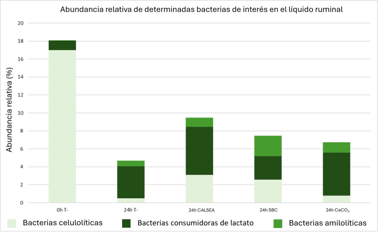 0h T- representa el control negativo sin tampón en el  tiempo 0. En esta etapa, el efecto acidógeno de la dieta no es visible, la situación se considera normal. Después de 24 horas de fermentación sin tampón (24h T-), la SARA se ha establecido y ha afectado negativamente a las bacterias celulolíticas, cuya población ha disminuido drásticamente. En comparación con el control negativo (T-24h), CALSEA (100 g/vaca/día) y SBC (200 g/vaca/día) parecen estimular la actividad celulolítica (Fibrobacter). Las bacterias consumidoras de lactato (Megasphaera) están más presentes con CALSEA y CaCO3 que con SBC. Esta última bacteria protege contra la SARA porque consume el ácido láctico. Este ensayo muestra que CALSEA favorece la actividad bacteriana celulolítica en condiciones acidógenicas, contribuyendo a mantener una eficacia ruminal óptima.