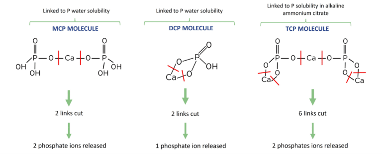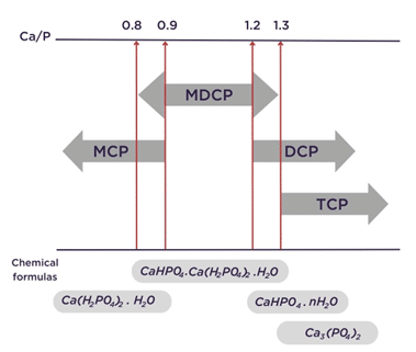 Es importante entender que los fosfatos comerciales para piensos no son productos puros. Un fosfato de calcio está compuesto por 3 tipos de moléculas: MCP, DCP y TCP. Así, puede existir bajo diferentes formas químicas en función de la concentración de cada una de estas moléculas dentro del fosfato.