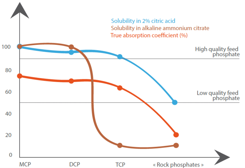 En la Figura 4, podemos ver que el P no se absorberá de la misma manera dependiendo de la forma en que se encuentre. Las pruebas in vivo muestran que las moléculas de MCP y DCP son mejor absorbidas por los animales monogástricos que la forma TCP, que es menos soluble (Guéguen 1988 ; Cromwell, 1989).