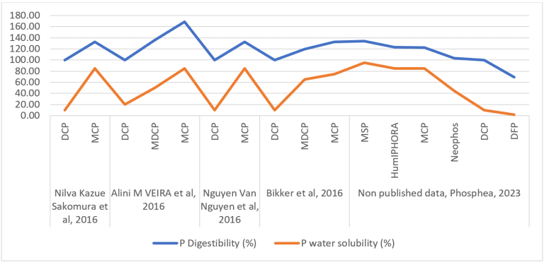 La solubilidad de P en agua proporciona información sobre la composición molecular de los fosfatos. De hecho, la solubilidad de P en agua se correlaciona positivamente con el contenido de la molécula MCP en los fosfatos de calcio y, por lo tanto, con la digestibilidad de los fosfatos para piensos (NRC, 2011). Cuanto mayor sea la solubilidad, mayor será la digestibilidad (Figura 3).