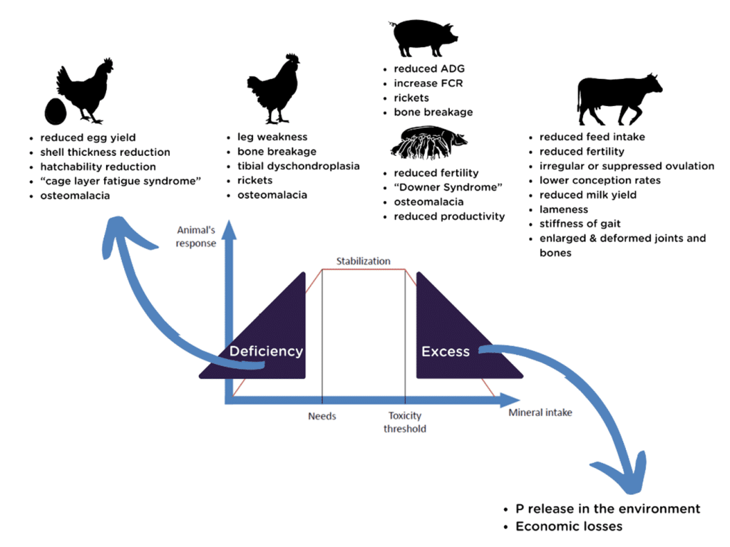 Sin un suministro adecuado de P, un animal sufrirá de deficiencia de fósforo. En todos los casos, esto afecta el bienestar físico del animal y su rendimiento económico. El efecto inicial es una caída en los niveles de fosfato en el plasma sanguíneo, seguido por el mecanismo de respuesta donde el Ca y el P son retirados de los huesos del animal. Además de una resistencia generalmente menor a las infecciones, esto a menudo resulta en pérdida de apetito y reducción en la ganancia de peso vivo debido a una eficiencia alimentaria deteriorada.
