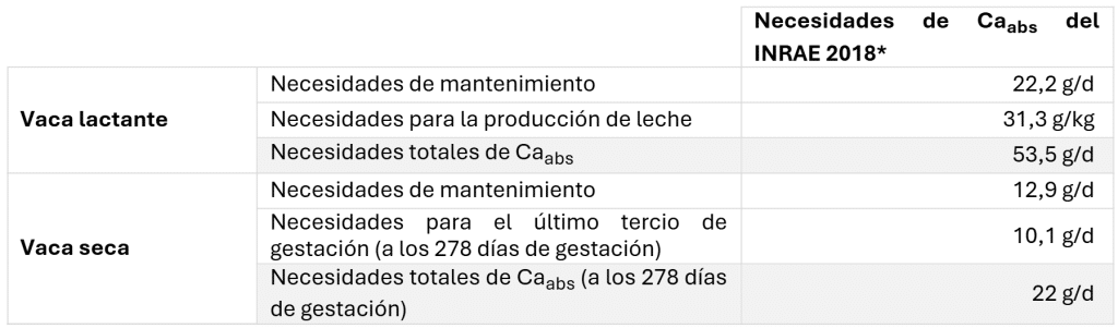 Las necesidades de Ca del ganado lechero se expresan en términos de Ca absorbible (Caabs). Caabs representa la parte de Ca que finalmente es absorbida por el animal y utilizable para sus necesidades. Entonces, los requerimientos de Ca para una vaca lechera corresponden a sus necesidades de mantenimiento, gestación y lactancia. Los requisitos de Ca de la vaca lechera lactante y la vaca seca se muestran en la tabla 1. En relación con el inicio de la producción de leche, se produce un aumento repentino en el Ca justo después del parto. En una situación normal, mecanismos homeostáticos pueden adaptarse a esta nueva demanda de Ca y mantener buenas funciones corporales.