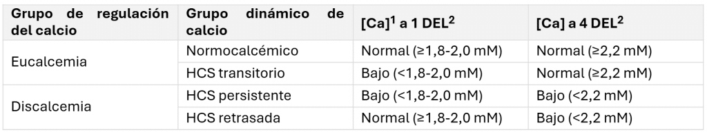 Hipocalcemia corresponde a una baja concentración de calcio en sangre justo después del parto. Una concentración baja de Ca en sangre después del parto es normal, ya que el calostro y la producción de leche crean un aumento repentino de la exportación de Ca (de 10 g/d a 30 g/d ; Oetzel et al., 2024). Pero, en condiciones normales, la concentración de Ca debería volver a la normalidad en un plazo de 4 días. En la literatura, el umbral para definir la hipocalcemia se establece para una concentración sanguínea de Ca de 85 mg/L (Oetzel et al., 2024). Hay dos tipos de hipocalcemia: la hipocalcemia clínica, también llamada fiebre de leche, y la hipocalcemia subclínica (HCS). La fiebre de leche y la HCS, que generalmente ocurren justo después del parto o durante los 3 días siguientes, se pueden distinguir con la aparición o no de síntomas. La tabla 2 muestra una clasificación de vacas recién paridas bajo diferentes situaciones de hipocalcemia basada en la dinámica de la concentración de Ca en sangre.