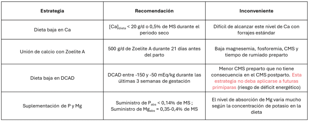 Se pueden observar diferentes estrategias de prevención de la hipocalcemia en el campo. La mayoría de ellas se basan en el manejo de la alimentación de vacas secas (Tabla 3). El objetivo de estas estrategias es preparar mejor a las vacas para hacer frente al repentino pico de demanda de Ca mediante la activación de los mecanismos de movilización de calcio. Una primera estrategia es disminuir el contenido de Ca de la dieta. Con una dieta baja en Ca, los mecanismos de movilización de Ca permanecen activos durante el período seco para evitar una reacción tardía al estrés por Ca durante el parto. En la misma idea, el uso de aglutinantes de Ca, como Zoelite A, puede ser una herramienta para disminuir la concentración de Ca en la dieta. Una segunda estrategia se basa en dietas bajas en DCAD. Una dieta baja en DCAD crea una acidosis metabólica compensada que favorece la absorción de Ca en el tracto gastrointestinal, mejora la sensibilidad de los receptores de PTH y aumenta la movilización de Ca de los huesos. Charbonneau et al. (2006) mostraron que la aparición de hipocalcemia está bien correlacionada con el pH urinario y el valor de DCAD de la dieta, calculado como DCAD (mEq / kg) = ([Na +] + [K +]) – ([Cl–] + 0.6 * [S2–]). Entonces, la elección del ingrediente del alimento que se incluye en la dieta es clave para esta estrategia, y la alimentación con sales aniónicas, como el cloruro de magnesio, puede ayudar a disminuir el DCAD. El suministro de P y Mg también es importante para prevenir la hipocalcemia, ya que aporta estos minerales para satisfacer los requisitos de los animales expresados por el NRC o el INRAE, por ejemplo. El objetivo es evitar el exceso de P y la hipomagnesemia.