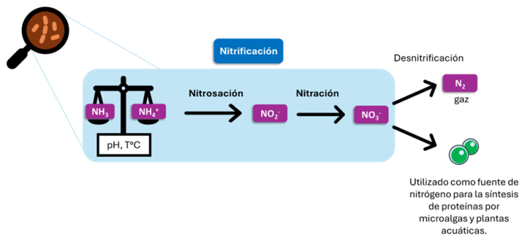 Para optimizar la nitrificación, es fundamental mantener un pH neutro, una buena oxigenación y un equilibrio redox en los estanques de peces y camarones (Molins-Legua et al., 2006). El NO3– producido por la nitrificación es absorbido y utilizado como fuente de nitrógeno por las plantas acuáticas y las algas, que reducen el NO3– a NH4+ para sintetizar aminoácidos y proteínas. Cualquier alteración del ciclo del nitrógeno puede afectar negativamente al rendimiento y a la supervivencia de los peces y camarones, ya que genera compuestos nitrogenados tóxicos, reduce la concentración de oxígeno (O2) y altera el pH del agua.