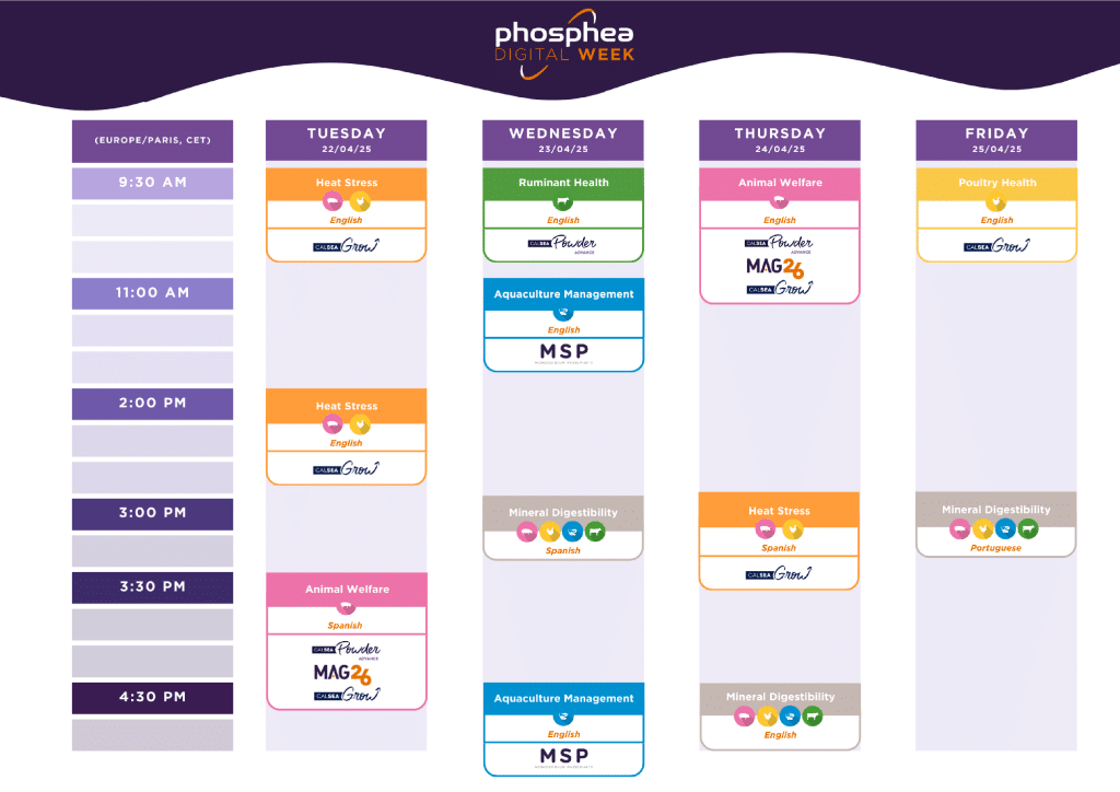 Los equipos de Phosphea lo invitan a una serie de seminarios web dedicados a profesionales de la nutrición animal. Este evento en línea se llevará a cabo del 22 al 25 de abril y cubrirá seis temas esenciales: