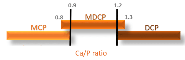 The most common types of IFP are Monocalcium Phosphate (MCP), Monodicalcium Phosphate (MDPC) and Dicalcium Phosphate (DCP).  These phosphates are primarily distinguished by their P and Ca contents: MCP has the highest P content and lowest Ca content while DCP has the highest Ca content and lowest P content. Ca/P ratio is thus a good tool to classify these 3 IFP types (Figure 1). Among the three, MCP is considered the highest quality phosphate thanks to its superior digestibility, which allows better P absorption by animals and contributes to reduced P excretion into the environment (Bikker et al., 2016 ; Gómez, 2023).