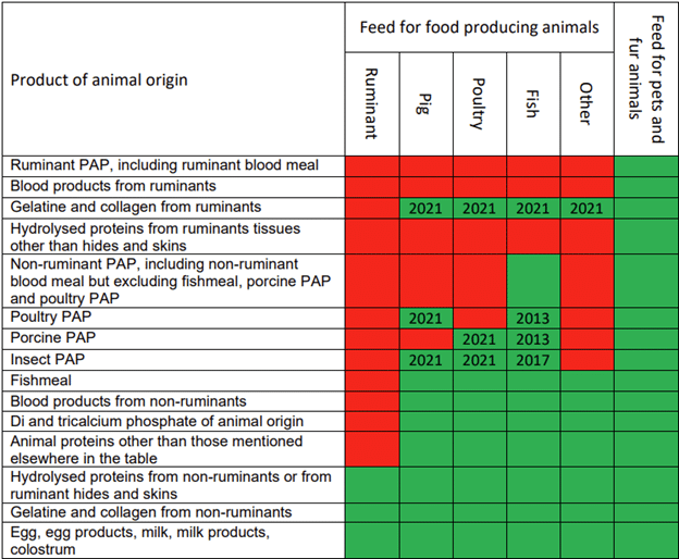 As the issues behind the feed ban for non-ruminants were resolved – including BSE control, species separation and reliable testing – , a 2021 EU regulation reauthorized, as showed in Table 1: