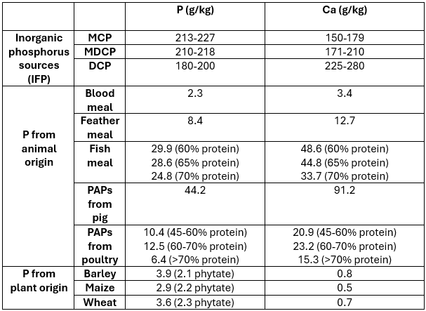 Table 5: P and Ca contents in various phosphorus sources: inorganic, animal and plant-origin (Phosphea, INRAe tables, 2025)