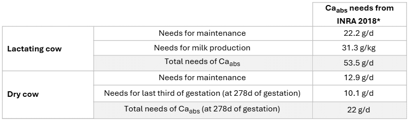Ca requirements of dairy cattle are expressed in terms of absorbable Ca (Caabs). Caabs represents the part of Ca that is finally absorbed by the animal and usable for its needs. Ca requirements for a dairy cow corresponds to its needs for maintenance, gestation and lactation.