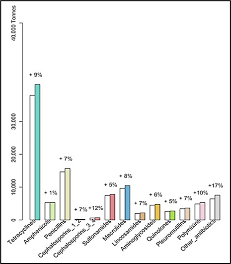 Regarding antibiotics for veterinary use to treat specific infections, tetracyclines are the most commonly used antimicrobials, with their usage predicted to increase by 9% by 2030 (Mulchandani et al., 2023) (Figure 3).