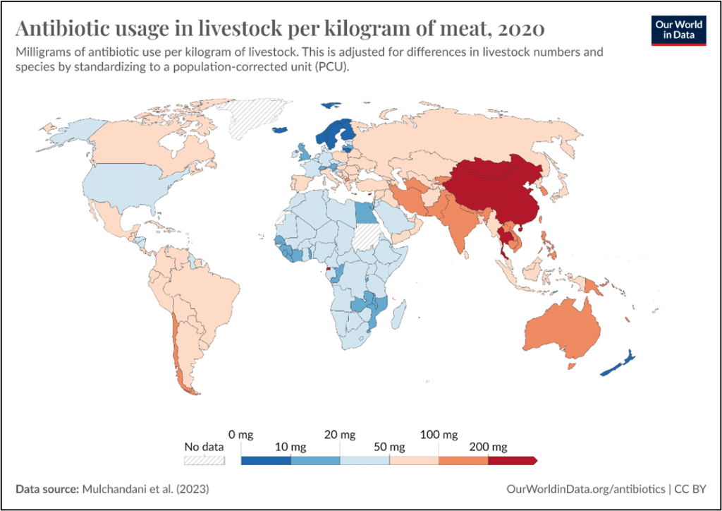 Figure 1: Worldwide antibiotic usage in livestock per kg of meat in 2020 (OurWorldInData.org)