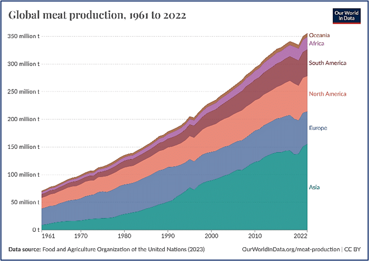 Figure 1: Global meat production from 1961 to 2022 (OurWorldInData.org)