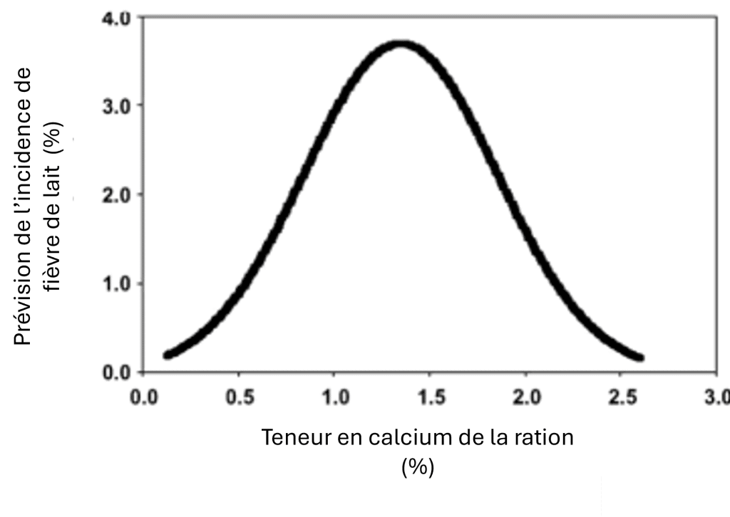 Figure 2: Evolution du risque d’hypocalcémie en fonction de la teneur en Ca de la ration (adapté de Dodin, 2020).