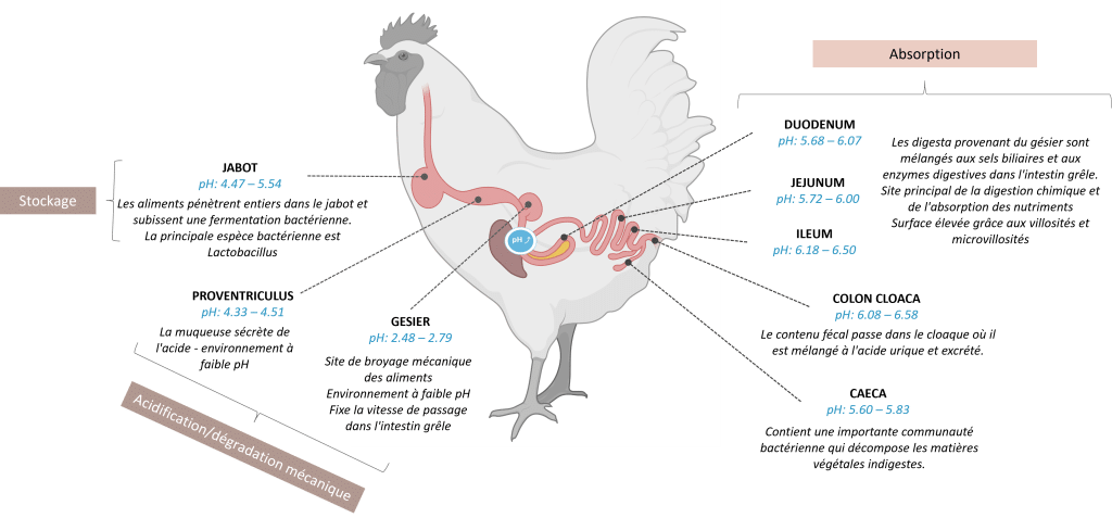 Dans les 24 heures suivant l’éclosion, le jabot est rapidement colonisé par les lactobacilles, qui fermentent les glucides dans l’alimentation et produisent de l’acide lactique, abaissant ainsi le pH de l’environnement de la culture. Le proventriculus, avec ses conditions très acides, ne convient pas à la plupart des bactéries, tandis que le gésier, également acide, contient des lactobacilles provenant principalement de la culture. Les poussins de 7 jours ont une abondance de Firmicutes et de Clostridiaceae dans l’iléon (Bailey, 2024 ; SFR, 2024).