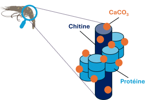 Les arthropodes tels que les crevettes ne possèdent pas de squelette interne comme les vertébrés, mais un squelette externe appelé exosquelette ou cuticule. Au fur et à mesure de sa croissance, la crevette doit se débarrasser de cet exosquelette rigide qui ne peut pas s’étirer et empêche sa croissance, avant d’en former un nouveau. Ce processus physiologique cyclique appelé mue ou ecdysis dépend de la disponibilité du calcium. En effet, l’exosquelette des arthropodes est constitué d’une matrice organique de chitine (20 à 30 % du poids sec) et de protéines, ainsi que de minéraux, notamment du magnésium et surtout du carbonate de calcium (CaCO3), qui représente 20 à 30 % du poids sec de l’exosquelette (Brannon et al., 1979 ; Stevenson et al., 1985) (Figure 2). Le CaCO3 se dépose sur la matrice organique et contribue à son épaississement et à sa résistance. Lors de la mue, une partie du Ca de l’ancien exosquelette est mobilisée et stockée dans l’hémolymphe et l’hépatopancréas, ce qui réduit sa rigidité et facilite l’exuvation et son élimination. Ensuite, la nouvelle cuticule, qui est alors souple et vulnérable, absorbe rapidement le Ca pour permettre sa calcification et son durcissement (Stevenson et al., 1985). On estime qu’environ 38 % des nutriments de l’ancienne cuticule sont recyclés (Lemos et al., 2021). De plus, de nombreuses espèces mangent l’ancienne cuticule, mais la digestibilité de ses minéraux est inconnue (Zanotto & Wheatly, 2002). La mue des crevettes est essentielle pour les protéger des prédateurs, des agents pathogènes et des blessures. Ainsi, une carence en Ca peut affecter la mue des crevettes, ce qui a un impact sur leur croissance et leur vulnérabilité.