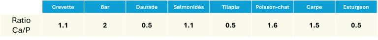Tableau 1. Ratio Ca/P conseillé pour différentes espèces aquacoles