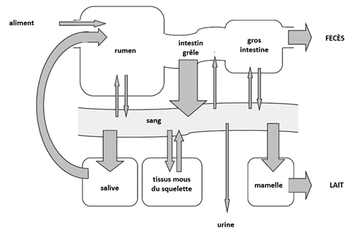 Figure 2 : Réservoirs de phosphore et voies de transport chez les ruminants (Goselink et al., 2015)