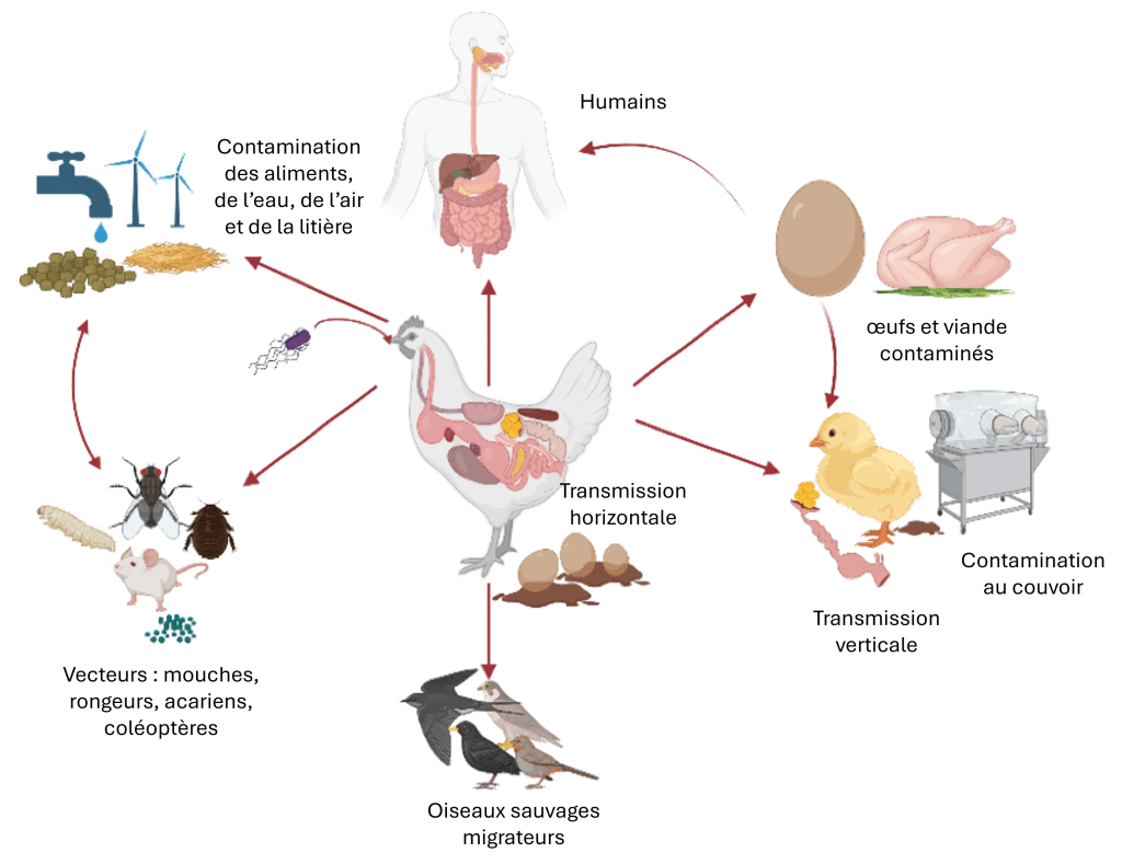 Figure 1 : Un exemple avec Salmonella spp. : Un aperçu des différentes voies de transmission. Créé avec BioRender.com