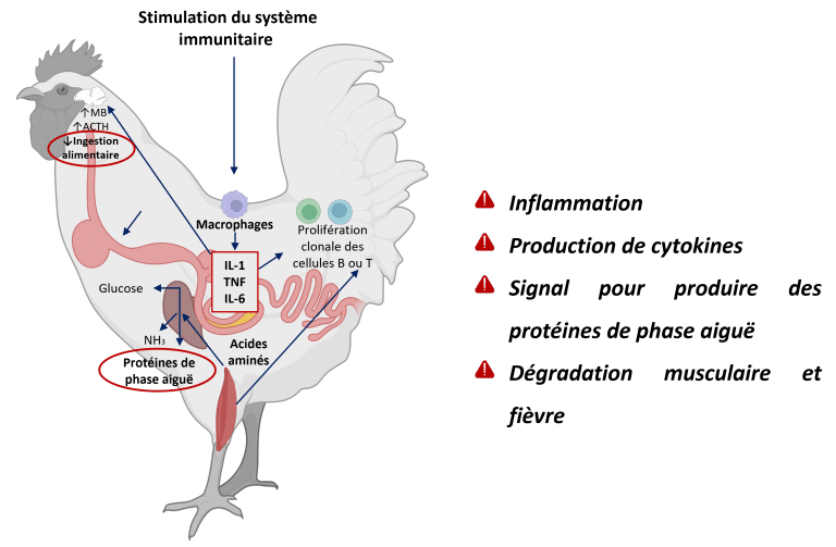 Figure 3 : Cascade inflammatoire chez les poulets : l’invasion du pathogène active les cellules immunitaires (macrophages), déclenchant la libération de cytokines (IL-1, TNF, IL-6). Ces signaux stimulent le foie à produire des protéines en phase aiguë, tandis que les effets systémiques incluent la dégradation des protéines musculaires pour l’apport en acides aminés et l’induction de la fièvre par régulation hypothalamique. Adapté de Klein (2020) ; Dridi et Scanes (2022) ; Schothorst Feed Research (2024). Créé avec BioRender.com