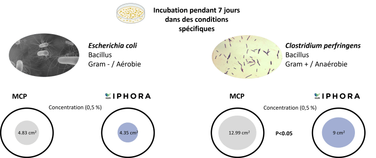 Figure 8 : Effet de HumIPHORA sur la croissance bactérienne (E. coli et C. perfringens)