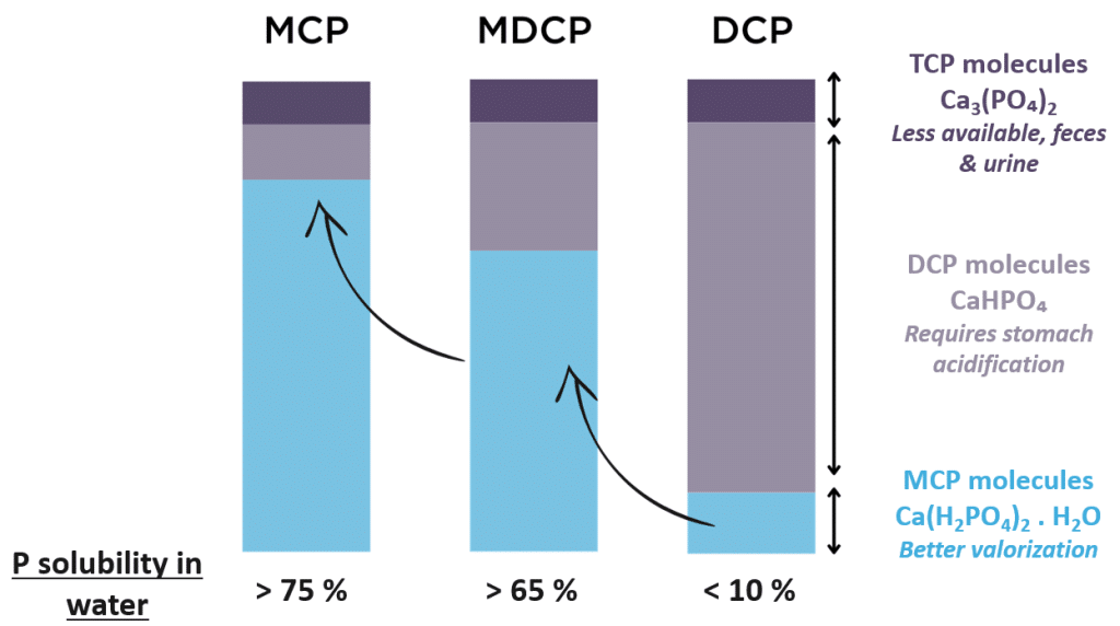 Dans les deux cas, une valeur trop élevée signifie que la réaction n’est pas complète : P et Ca ne sont pas totalement liés. Le risque est plus élevé pour les phosphates hygroscopiques comme le MCP.