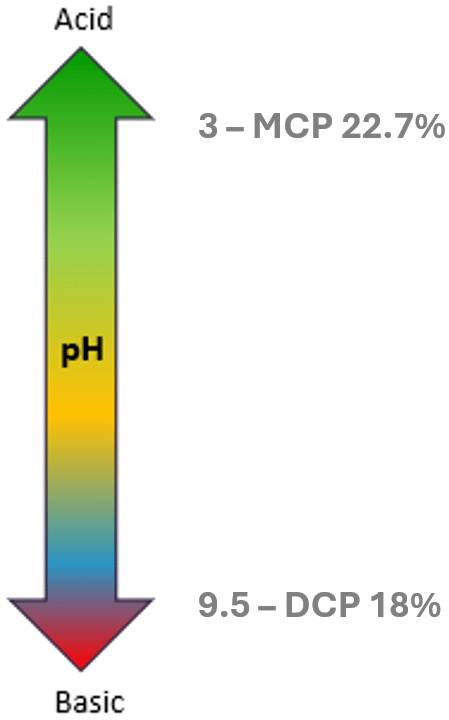 Le pH d’un phosphate doit être pris en considération en fonction de l’espèce concernée et de l’utilisation du produit final. Le pH a un impact sur l’activité enzymatique et la solubilisation des nutriments dans l’estomac. Les ruminants ont un pH ruminal basique à neutre (6-7) tandis que les monogastriques ont un pH gastrique acide (2-3). Les formulateurs d’aliments pour porcs et volailles recherchent donc du phosphate à faible pH pour protéger l’intestin des agents pathogènes et favoriser la solubilisation des nutriments. Ils utilisent même parfois des agents acidifiants qui aident à maintenir un pH optimal dans l’estomac, permettant un bon fonctionnement des enzymes protéolytiques et le contrôle de la microflore intestinale.