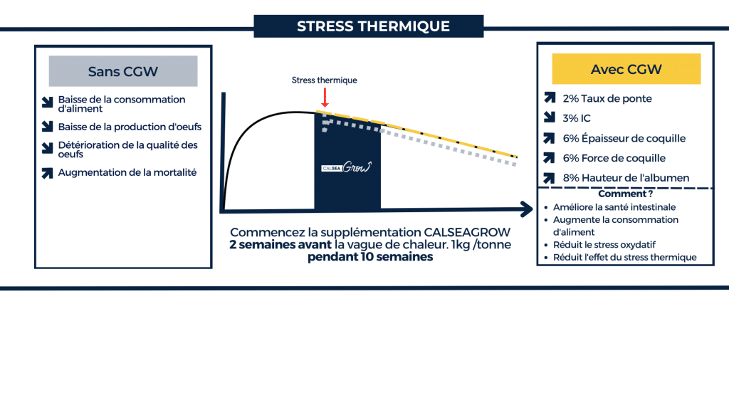 Notre recommandation est la suivante : Supplémenter CALSEAGROW 2 semaines avant la vague de chaleur, afin d’aider à contrer les effets négatifs du stress thermique.