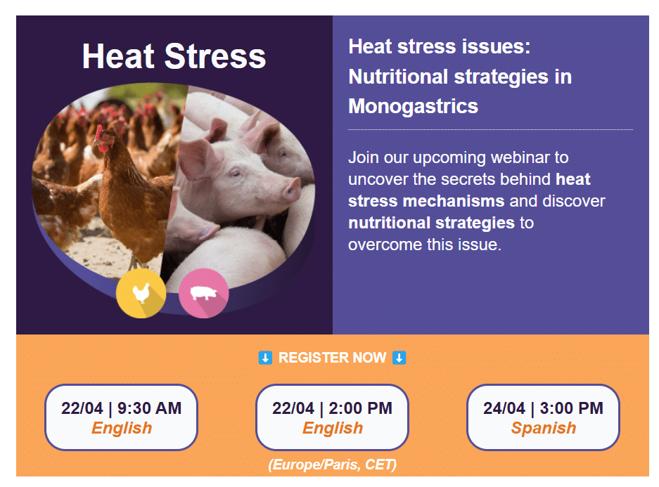If you want to learn more about this topic, feel free to register for our webinar titled “Heat Stress Issues: Nutritional Strategies in Monogastric Animals.“