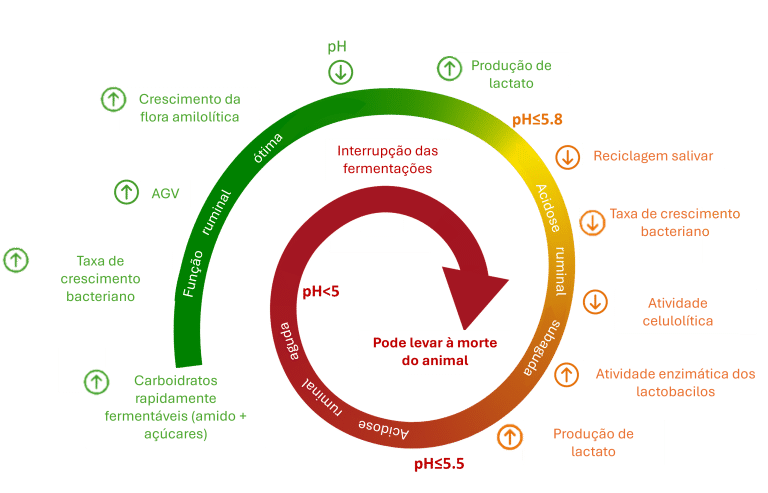 Os ruminantes diferem de outros animais devido ao seu sistema digestivo: possuem um rúmen. O rúmen é o principal ator da digestão nos ruminantes e abriga os microrganismos responsáveis pela fermentação biológica dos alimentos. Assim, alimentar um ruminante é alimentar seu microbiota ruminal. Originalmente, os ruminantes são adaptados a digerir principalmente forragens, mas a evolução dos sistemas de produção transformou sua dieta. A produção mundial de leite aumentou em mais de 142 milhões de toneladas em dez anos (+ 21,7%; FAO, 2024). Para aumentar a produção de leite ou o desempenho de engorda, os produtores utilizam dietas mais intensivas que, se não forem bem manejadas, alteram o ambiente ruminal e levam a uma acidose ruminal subclínica (Sub-Acute Ruminal Acidosis ou SARA, em inglês). A SARA é um problema muito comum em ruminantes, pois entre 19% e 26% das vacas de rebanhos leiteiros intensivos apresentam SARA (Kleen et al. 2013). A presença de SARA está associada a perturbações significativas na saúde e no desempenho animal, incluindo uma redução de 10% na digestibilidade da fibra (Orne Conseil Élevage, 2016), e uma redução média de 2,7 kg de leite produzido por vaca por dia (Enemark, 2008). Este dossiê técnico detalhará as consequências e estratégias de gestão da SARA.