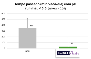 As vacas que recebem o tratamento com bicarbonato de sódio (SBC; 200 g/vaca/dia) apresentam pH ruminal médio mais baixo do que aquelas com o tratamento CALSEA (100 g/vaca/dia; Figura 4). O pH ruminal mínimo obtido com o tratamento SBC é de 5,45, significativamente inferior ao obtido com CALSEA (Figura 4). Além disso, com CALSEA, o percentual de animais com pH ruminal < 5,5 é significativamente inferior ao do SBC (Figura 4). Um pH < 6, por pelo menos 4 horas, representa risco de acidose e, quando o pH é <5,5, esse risco é elevado. Segundo os resultados, a capacidade tamponante do CALSEA é superior à do SBC.