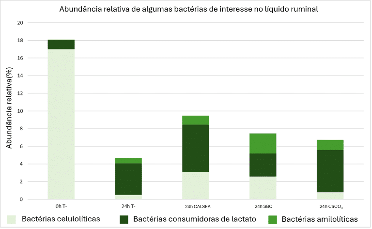 0h T- representa o controle negativo sem tampão no tempo 0. Nesse estágio, o efeito acidogênico da dieta não é visível e a situação é considerada normal. Após 24 horas de fermentação sem tampão (24h T-), a SARA se instala e afeta negativamente as bactérias celulolíticas, cuja população diminui drasticamente. Em comparação com o controle negativo (T-24h), CALSEA (100 g/vaca/dia) e o SBC (200 g/vaca/dia) parecem estimular a atividade celulolítica (Fibrobacter). As bactérias consumidoras de lactato (Megasphaera) são mais presentes com CALSEA e CaCO3 do que com SBC. Esta última bactéria protege contra a SARA porque consome ácido lático. Este ensaio mostra que CALSEA favorece a atividade bacteriana celulolítica em condições acidogênicas, contribuindo para manter uma eficiência ruminal ótima.