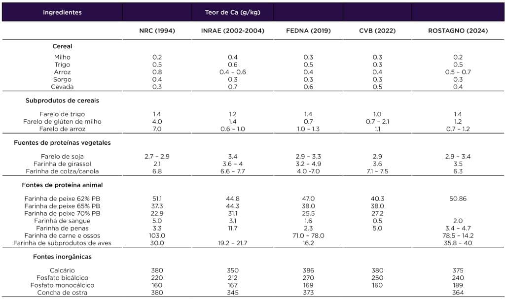 Os ingredientes vegetais são naturalmente pobres em cálcio e, para atender às necessidades nutricionais, fontes inorgânicas de Ca são utilizadas como calcário, fosfato bicálcico e monocálcico (Anwar, 2017; Kiarie & Nyachoti, 2010; González-Vega e Stein 2014) (Tabela 1).