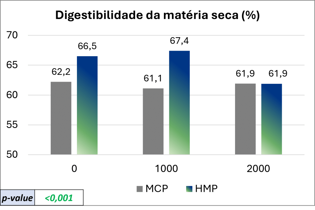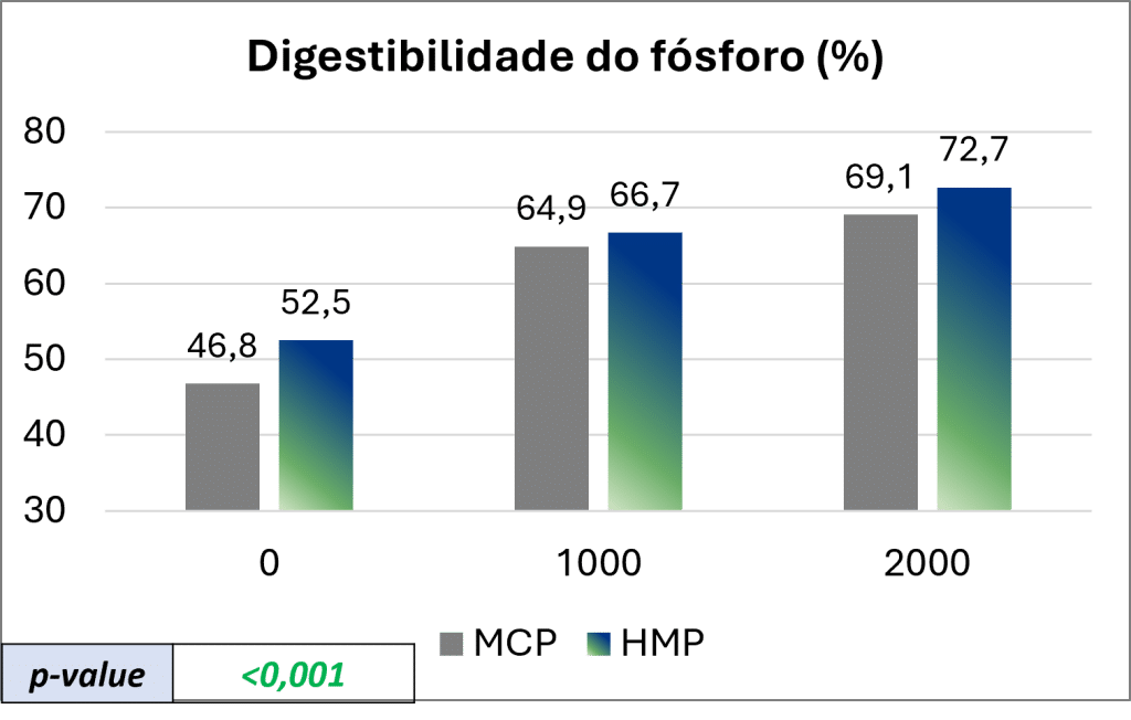 Um estudo realizado em colaboração com a Universidade de Madrid apoia esse mecanismo de ação, mostrando maior digestibilidade do fósforo, matéria seca e matéria orgânica em dietas contendo HumIPHORA em comparação com aquelas com fosfato monocálcico (MCP). A digestibilidade da matéria orgânica, nesse contexto, reflete a melhor utilização de aminoácidos e proteínas (Figura 5).
