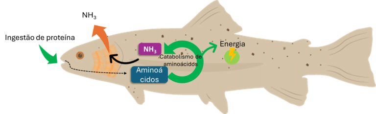As proteínas ingeridas pelos animais são rapidamente hidrolisadas em aminoácidos no trato digestivo pela ação de várias enzimas específicas: as pepsinas primeiro decompõem as proteínas em peptídeos, e posteriormente a tripsina e a quimotripsina convertem os peptídeos em aminoácidos (Engrola et al., 2009; Gamboa-Delgado et al., 2011). Esses aminoácidos são então absorvidos pelas células intestinais e usados para sintetizar novas proteínas ou para produzir energia por meio da desaminação (Bröer, 2008). O grupo amina é convertido em amônia (NH3), um resíduo metabólico que é tóxico para os animais se acumulado (Forster e Goldstein, 1969). Os organismos aquáticos podem excretar rapidamente o NH3 na água através das suas brânquias, evitando assim a sua conversão e conservando energia em comparação com animais ureotélicos, como mamíferos e aves (Figura 1).