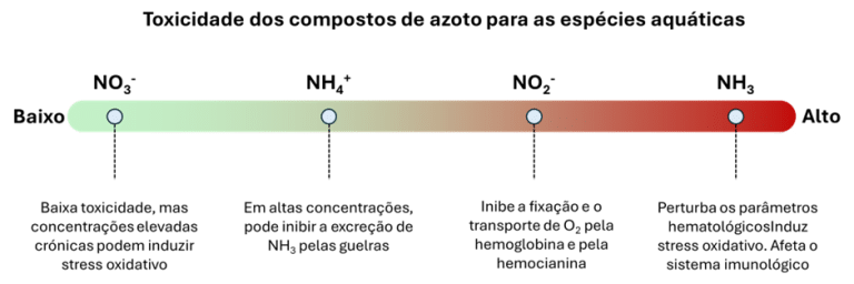 O nitrogênio liberado na água pode afetar os animais aquáticos direta ou indiretamente. As diferentes formas de nitrogênio descritas acima, incluindo NH3, NH4+, NO2– e NO3–, apresentam níveis distintos de toxicidade para peixes e camarões. Embora as concentrações-limite na água para os diversos compostos de nitrogênio variem conforme a espécie, a ordem de toxicidade permanece a mesma para todas: NH3 é o mais tóxico, seguido por NO2–, depois NH4+ e, por último, NO3– (Figura 3).